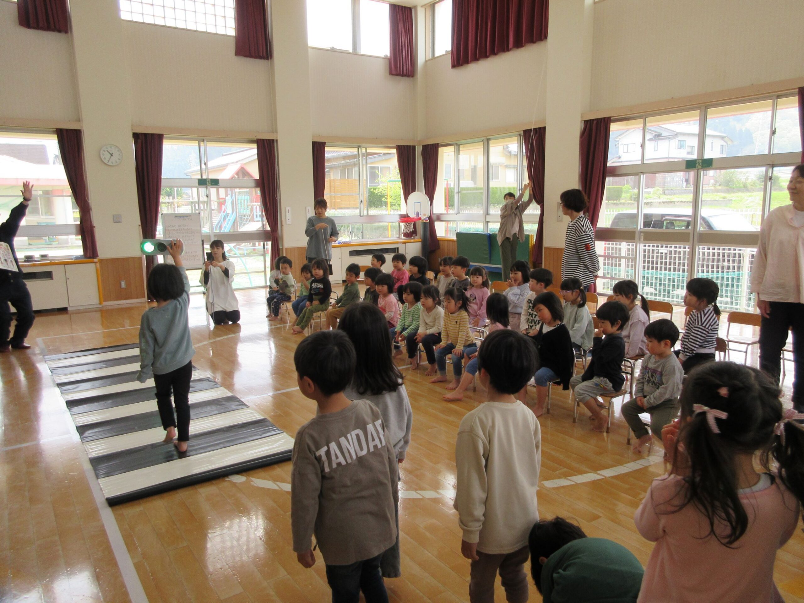 DVD視聴、横断歩道の渡り方指導等のほか、保育所オリジナルの交通安全の歌の合唱がありました。