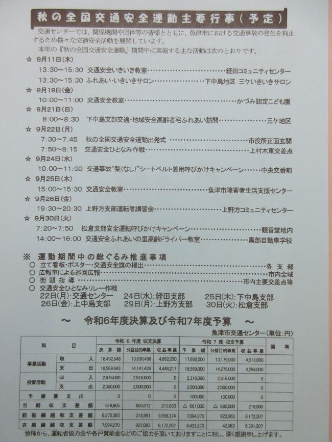 表に秋の全国交通安全運動の重点や重点日を、裏に秋の全国交通安全運動の交通センターにおける行事計画と、令和6年度決算と令和7年度予算を掲載しました。