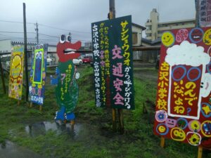 9月18日(木)、古沢小学校の生徒が思い思いに描き完成した、サンショウウオから安全運転を呼びかける交通安全パネルを古沢支部(支部長 島田博昭)が設置。「スマホ見てない?」「スピード出てない?」「飲んでないよね」等のメッセージをドライバーに呼びかけます。