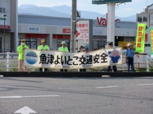 出発式の後は、アップルヒル角の信号交差点において、「魚津 よいとこ 交通安全」の横断幕を掲出しながら、出発式参加者による大人数の交通監視ひとなみ作戦を実施しました。