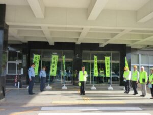 22日(月)7:30~魚津市役所前において秋の全国交通安全運動出発式を実施し、交通センター会長の魚津市長、魚津警察署長、交通指導員、地域交通安全活動推進委員、交通安全アドバイザー、交通センター役員の関係者が歩行者の安全確保など5項目の交通安全宣言を採択しました。