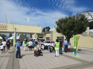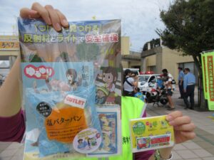9月20日(土)、「くろべフェア KUROBE働く車の展示会場」のパトカー等試乗、写真撮影会に訪れた家族連れに、「21日から交通安全運動が始まります。交通安全でお願いします。」と、「交通安全運動チラシ、交通安全注意んガム、無事かえる!ティッシュ」等を配布し、交通安全を呼び掛けました。