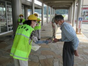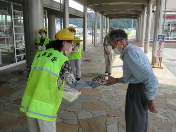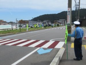 黒東交通安全協会等の交通安全関係団体員約30名が、横断歩道思いやりの日である9月22日(月)午前10時から朝日町のあさひ総合病院前の交差点と病院玄関において、歩行者に横断歩道の利用とサンドサイン、車両の運転者には横断歩道における歩行者優先を呼びかける「stop横断歩道キャンペーン」を実施しました。