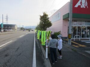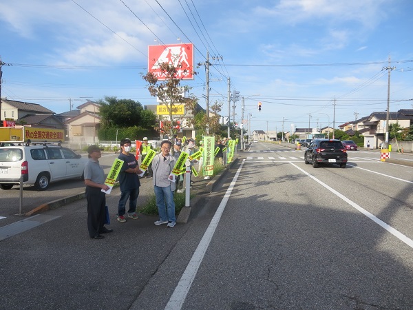 9月22日(月)午前7時30分から、主要地方道富山立山公園線の藤木南交差点から一番町交差点までの約5キロ区間で、当協会(藤ノ木・東部・清水町・五番町・八人町・総曲輪)6支部と富山南交通安全協会富山中部地域支部の計7支部員、富山市、交通指導員、警察官等の約200人が合同で桃太郎旗や横断幕を掲示し、ドライバー等に交通安全を呼びかけました。
