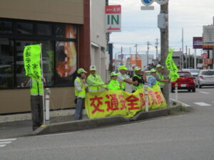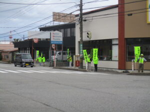 9月25日(木)午前7時20分から、富山市中川原地内の餃子の王将中川原店前交差点において、富山南交通安全協会山室地域支部が企画した交通安全人波作戦が行われました。同人波作戦には、富山南警察署員、山室地域支部役員、長寿会連合会会員の高齢者など約40名が参加し、各自交通安全啓発旗や横断幕を掲げて、通行する車両の運転者の皆さんに秋の全国交通安全運動の広報と交通事故防止を呼びかけました。