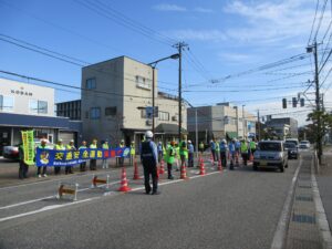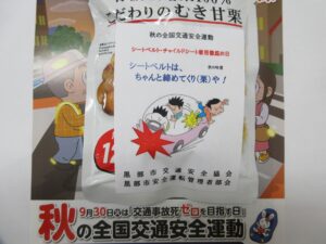 シートベルト・チャイルドシート着用徹底の日」である9月24日(水)に、黒部市交通対策協議会員、黒部警察署員、交通安全協会員、安管部会、交通指導員、地活推進員が、黒部消防署前を通行するドライバー約200人に「シートベルトは、ちゃんと締めてくり(栗)や!」と銘打ち、秋の味覚「甘栗」等を配布して、シートベルト着用を呼びかけました。
