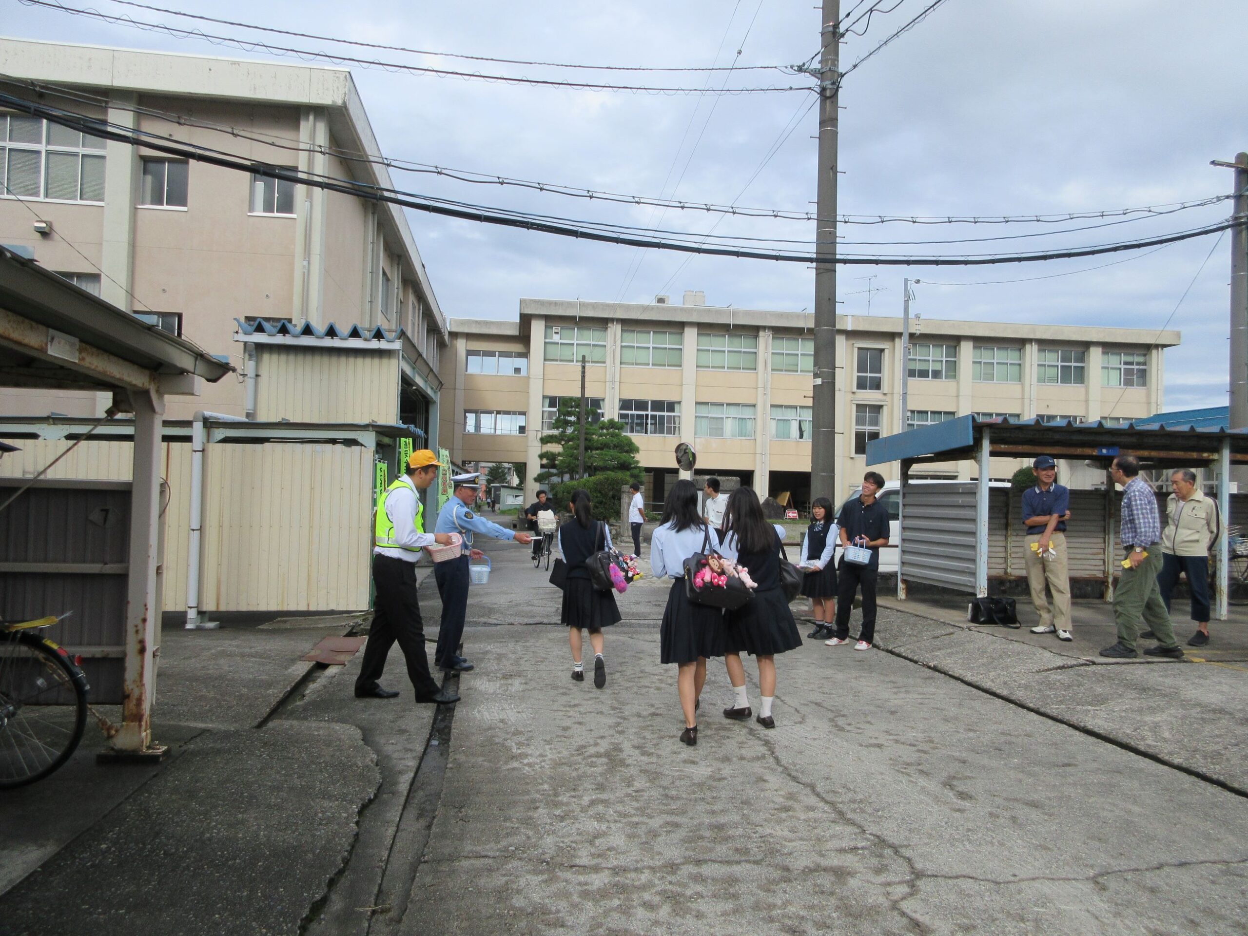 「自転車安全利用の日」である9月25日(木)に、桜井高校サイクル安全リーダーらが、通学してくる高校生に「自転車五則ティッシュペーパー」を配布して、ヘルメット着用等を呼びかけました。併せて、自転車商組合員4名が通学自転車約280台を点検し、44台にブレーキ、ベル、タイヤすり減り、反射灯不良等のカードを自転車に貼付し、安全利用を呼びかけました。