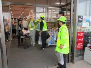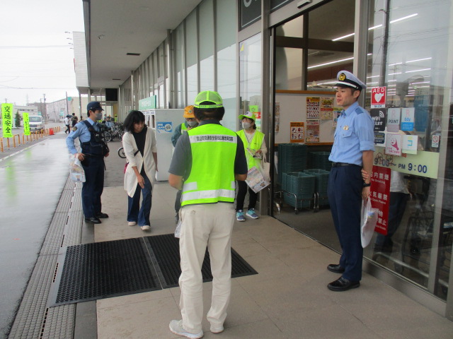 9月25日(木)午前11時から、富山市秋吉地内のショッピングセンター「大阪屋ショップ秋吉店」で富山南交通安全協会山室地域支部が企画した交通安全キャンペーンが行われました。同キャンペーンには、富山南警察署員、山室地域支部役員、交通指導員などが参加し、買い物に訪れた皆さんに、交通安全チラシや交通安全グッズを配付して、秋の全国交通安全運動の広報と交通事故防止を呼びかけました。