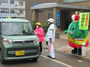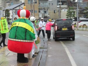 9月25日(木)午前10時から入善町のうるおい館前において、入善町商工会女性部が秋の運動チラシとキャンディーを通行車両に配布し、全座席のシートベルト着用を呼びかけるキャンペーンに黒東交通安安全協会や交通安全関係団体約25名ものぼり旗を掲示するなどし同キャンペーンに参加しました。キャンペーンに先立ち入善町のゆるキャラジャンポールⅢ世に一日入善警察署長が委嘱され、通行車両にシートベルト着用を呼びかけました。