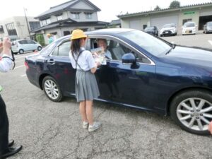 等総勢20名は、鷹栖ふれあい広場前を通行する運転者に対し、自転車のヘル