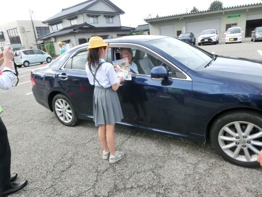 メット着用と交通ル-ル遵守の徹底を啓発チラシと反射リフレクタ-等を配