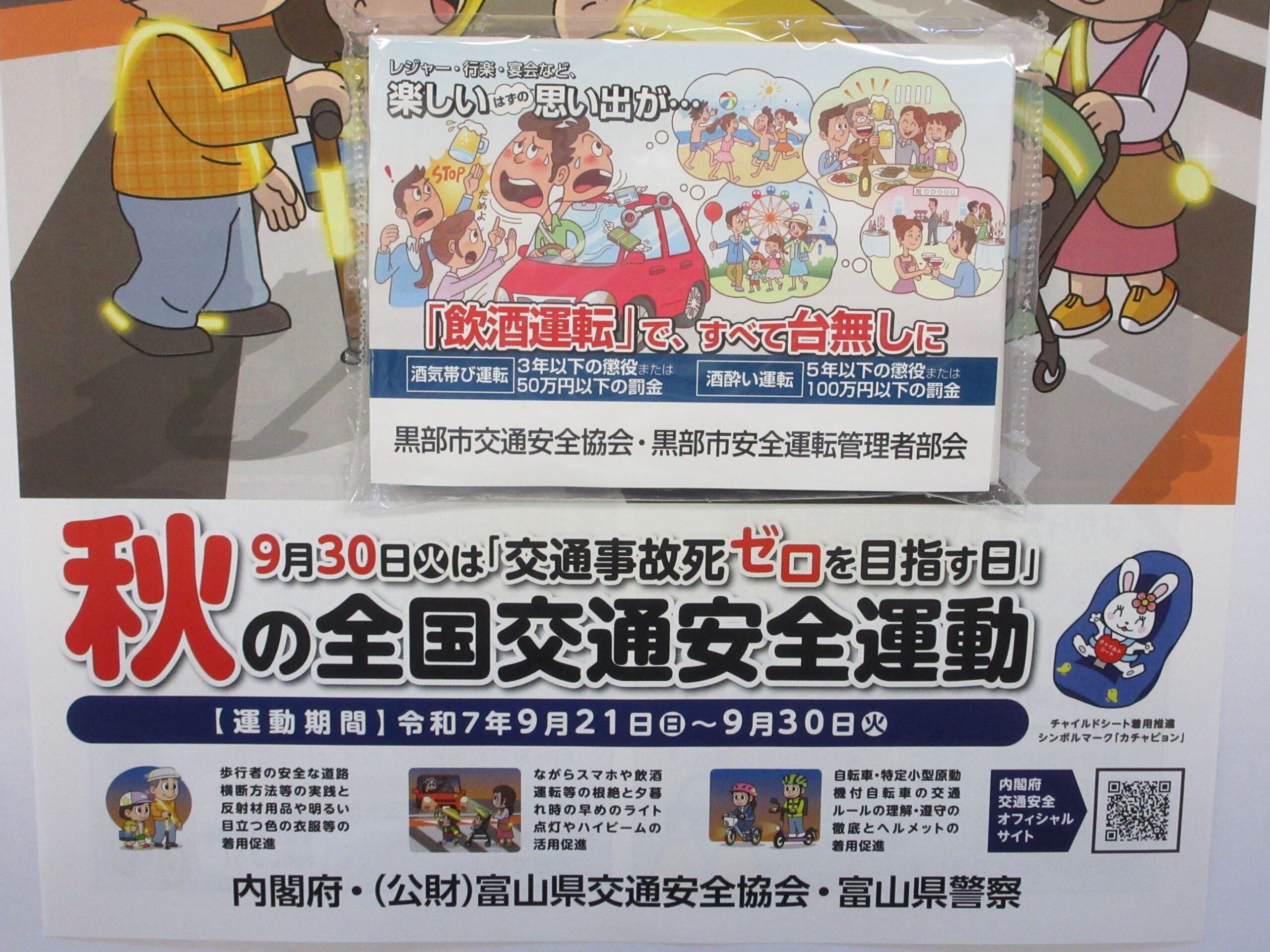 9月26日、黒部市交通対策協議会、黒部警察署、交通安全協会は、「飲酒運転根絶の日」に併せて、「飲酒運転撲滅」のティッシュペーパー等を配布して、「飲酒運転根絶」を呼び掛けました。