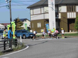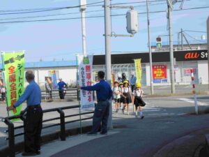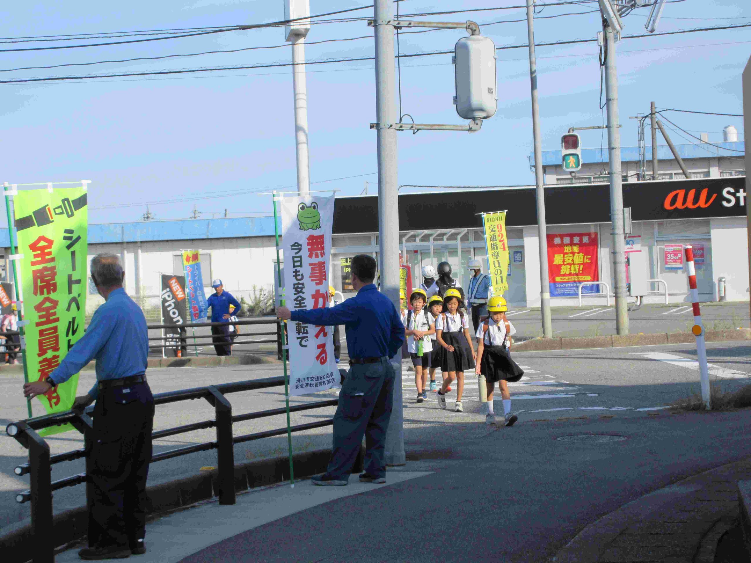 9月24日(水)、「シートベルト・チャイルドシート着用徹底の日」に、 上小泉西交差点付近で交通安全のぼり旗を掲げ、ドライバーに シートベルト・チャイルドシートの着用徹底を呼びかけました。 また、この日は「交通指導員の日」でもあることから、交通指導員による のぼり旗掲揚も行いました。