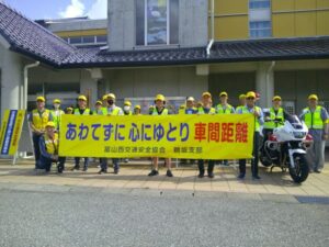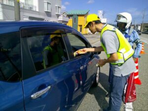 9月27日(土)午前10時から、鵜坂公民館前において鵜坂支部(支部長 澤村明)が、「視界が悪い秋の夕暮れ時、ゆっくり(栗)行かんまいか~!」のラベルを貼付した栗をドライバーに配布し、交通安全を呼びかけました。