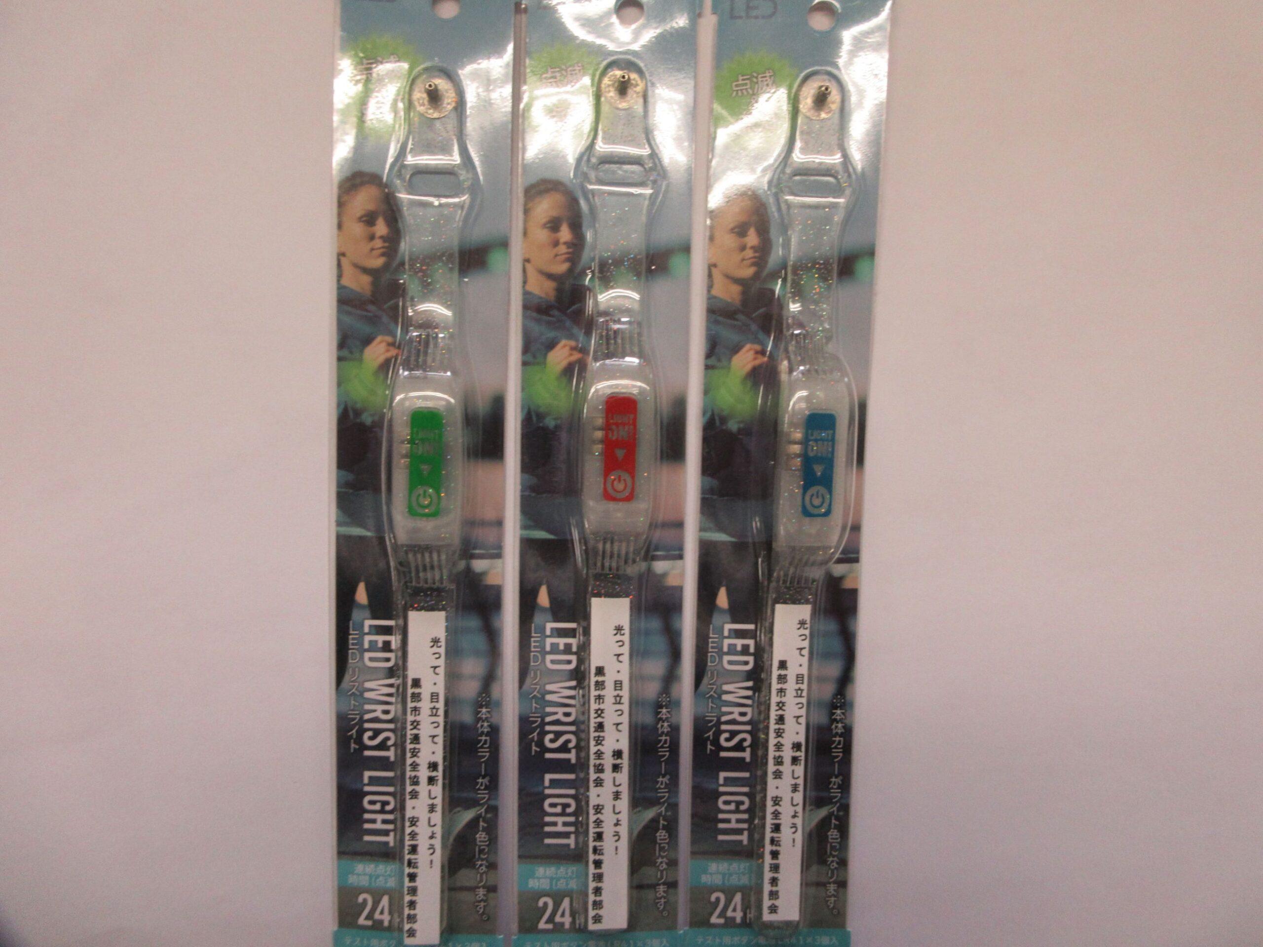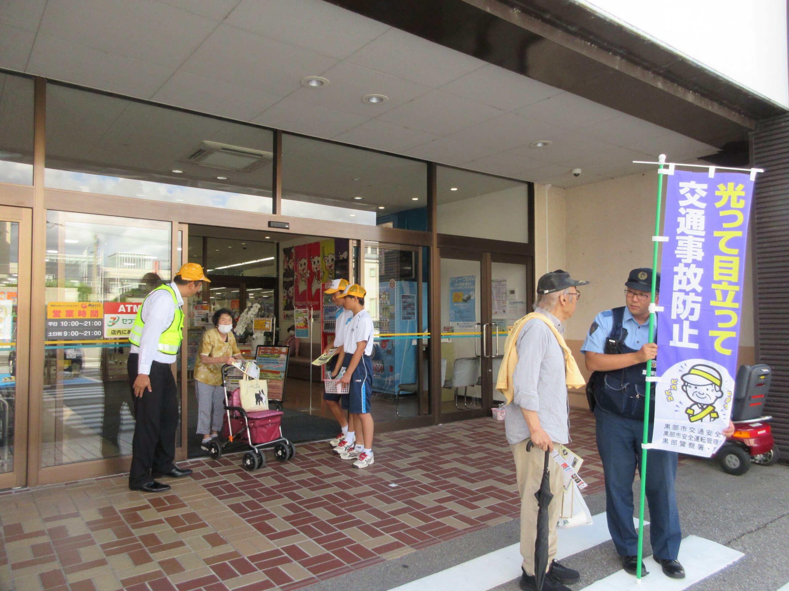 9月29日、黒部市交通対策協議会、黒部警察署、交通安全協会及び14歳の挑戦に来署している明峰中学生4人は、「高齢者交通安全呼び掛けの日」に併せて、ショッピングセンターにおいて、「暗くなるのが早くなりました。光って、目立って、横断しましょう!」と自発光式LEDバント」を約100人に配布して交通安全を呼び掛けました。