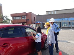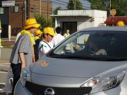 当協会大島支部(支部長:山中義直)は、9月24日(水)午後3時から、大島小学校4年生らとともに、5月に小学校の花壇に手植えしたヘチマから収穫したヘチマ水を「事故へっちまえ」との願いを込めてドライバーに手渡し、交通事故防止を呼び掛けました。