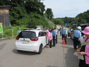 9月22日(月)、南砺警察署と石川県金沢中警察署合同で、県境の金沢市医王山小中学校前道路において、交通安全のチラシと「交通事故無し」と銘打ち通行ドライバーに梨を配布し交通安全を呼びかけました。
