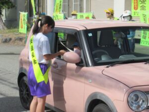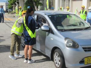 交通事故死ゼロの日である9月30日(火)午前10時から、入善警察署に14歳の挑戦で職場体験中の入善中学校と朝日中学校の9名が、交通安全アンバサダー2名や黒東交通安全協会や関係団体約40名とともに、入善警察署前において、入善でとれたこしひかりの新米2合(100セット)と安全運動のチラシを「交通事故無く新米け」と通行車両の運転者等に配布し、安全運転を呼びかけました。