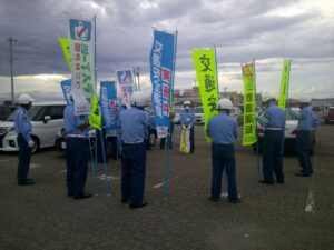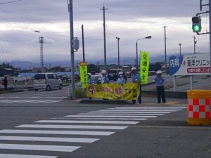 「交通事故死ゼロを目指す日(全国指定日)」の9月30日(火)午後5時から、ファボーレ前交差点において、富山西交通指導員連絡協議会(会長 太田勲)が横断幕及びのぼり旗を掲げる人波作戦を実施し、交通安全を呼びかけました。