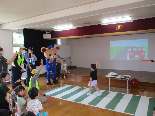 10月1日(水)午前10時から、富山市上千俵町地内の富山市立月岡幼稚園において交通安全教室が行われました。同交通安全教室には、月岡幼稚園の園児18名のほか、富山南警察署員、富山南交通安全協会月岡地域支部役員、富山市危機管理課員が参加し、初めに交通安全DVDを視聴した後、模擬横断歩道を使用して横断歩道の安全な渡り方を実習しました。同教室には、富山南交通指導員連絡協議会のマスコットキャラクター「くまちゃん」も参加し、上手に横断できた園児達をハイタッチで出迎えました。