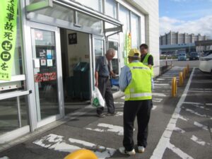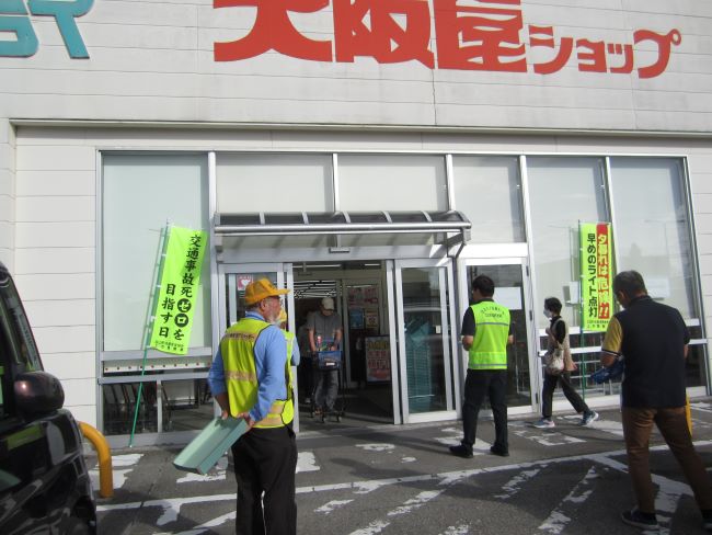 交通安全アドバイザーと交通安全協会は、9月30日、立山町日俣地内の大阪屋ショップ立山店において、同店利用客に対し「交通事故死ゼロを目指す日」にちなんで啓発用品や広報チラシを配布して交通事故防止を呼びかけました。