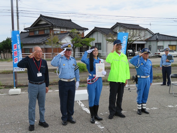 尚、委嘱状交付式において、藤井南砺警察署長、岩﨑南砺市交通安全協会長から激励の言葉を受け、白バイ及びパトカーが1日委嘱隊長から出発の合図を受け交通安全活動に出発しました。