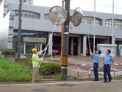 カーブミラー清掃には、小矢部警察署員も参加し、「無事故を願い」丁寧に清掃しました。
