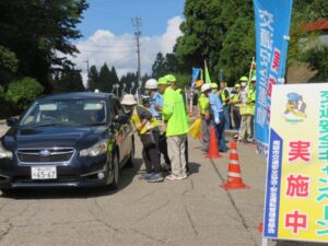 9月27日(土)、南砺市交通安全協会南蟹谷地区支部(青木幸政支部長)は、地区役員、地域づくり協議会、交通指導員が連携し、県境で南砺市内に入る通行車両に「ゆっくり(栗)走ろう!南蟹谷」と銘打って甘栗等を配布し「悲惨な交通事故の絶滅」と「交通安全運転の励行」を呼びかけました。