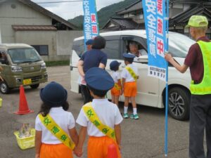 9月29日(月)、南砺市交通安全協会井波地域支部南山見地区支部(久恵博明支部長)は、山野保育園と連携し、当園年長児が扮する警察官「やまのキッズポリス」が「安全運転しんまい(新米)けー」と銘打ち、新米1合等を通行車両に手渡し、安全運転を呼びかけました。