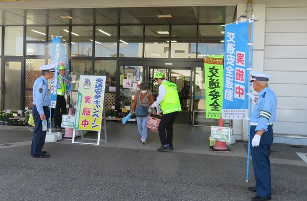 9月30日(火)、南砺市交通安全協会安全運転管理者部会(石崎功部会長)と交通指導員部会(安田友明部会長)は、買い物客にチラシとゼロカロリー飲料を手渡し、交通死亡事故ゼロを呼びかけました。