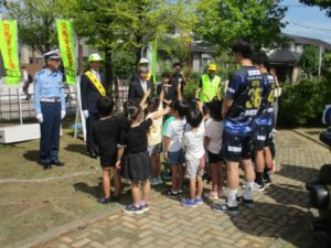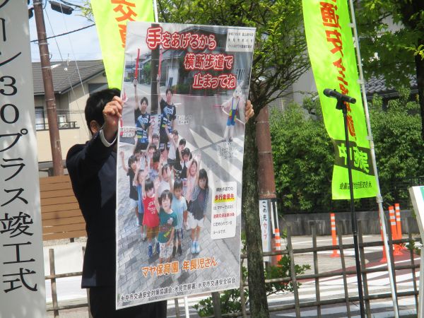 また出発式では、マヤ保育園の年長児が富山ドリームスの選手とともに交通安全宣言をし、両者の協力を得て作成した「横断歩道での歩行者優先」を呼びかけるポスターの披露も行いました。