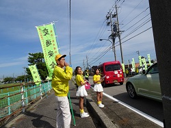 当協会作道支部(支部長:浅岡繁)は交通安全母の会等と共に、9月28日(日)午前10時から約30分間、射水市立作道小学校前において、「飲酒運転撲滅」「飲酒運転根絶」の横断幕やのぼり旗を掲げ、通行中のドライバーに交通事故防止を呼び掛ける人波作戦を展開しました。また、射水交通安全大使「IMZip」とともに、交通安全週間のチラシとヤクルトを通行車両に手渡し、飲酒運転防止と安全運転を呼びかけました。