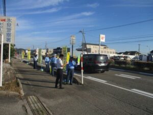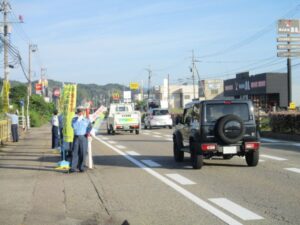 9月24日(水)氷見警察署前において、交通指導員7名は昨年から富山県下で制定された「9月24日交通指導員の日」に、国道160号を通行するドライバーにハンドプレートを使用して交通安全を呼びかけました。