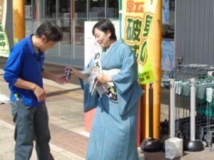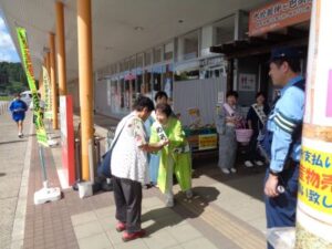 9月26日(金)小矢部市内の飲食店宿泊施設の女将で組織する「メルヘン女将」と小矢部地域交通安全活動推進委員は、道の駅メルヘンおやべにおいて、飲酒運転撲滅キャンペーンを行い、道の駅メルヘンおやべを利用するドライバー等にゼロカロリーの缶コーヒー、交通安全啓発チラシ等を配布し、飲酒運転の根絶と安全運転の励行を呼びかけました。