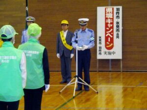 9月25日(木)羽咋市神子原スポーツセンターにおいて、「交通安全に県境はない」を基本に「415縁(良いご縁)ロードから無事故の輪を広げよう」をスローガンとして、両市長・警察署長・交通安全協会長・県土木所長らが会して氷見市・羽咋市合同交通安全県境キャンペーンを開催し、両市の代表が交通安全宣言をしました。