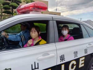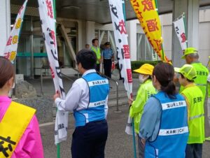 上市町の秋の全国交通安全運動出発式は、9月19日(金)に開催され、会場である上市町役場前広場には、関係者約80人が参加する中、セーフティレディーの委嘱を受けている㈱コージンの女性社員2人が、交通安全宣言を読み上げました。また、出発式では、セーフティレディーもパトカーに乗車し、交通安全の呼びかけをマイク広報しながら、町内を巡回しました。