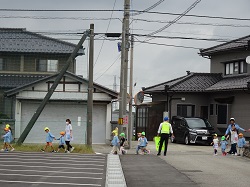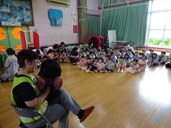 当協会では、射水警察署・射水市交通安全対策協議会とともに、10月8日(水)射水市立池多保育園(参加園児50名)で、交通安全教室を開催しました。協会職員による腹話術、警察官による交通安全講話の後、年長・年中児童は園周辺の道路や信号のある交差点で、年少児は遊戯室で模擬横断歩道を使った横断歩行練習を行いました。
