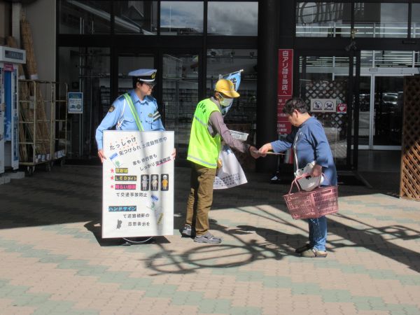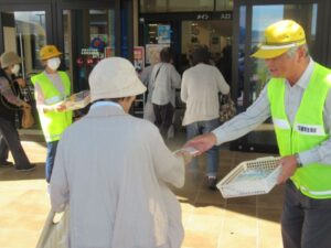 本年1月と9月に入善町地内において、高齢者の死亡事故が2件発生したことから、入善ショッピングセンターコスモ21のシルバーデイである10月15日(水)午前10時から、入善警察署と黒東交通安全協会入善地区の支部長や女性部会・高齢者部会の会員約20名が、「たっしゃけ 気つけられェ運動」のチラシとポケットティッシュを買い物客等に配布し、思いやり運転や反射材の活用、横断歩道でのハンドサインの励行など、高齢者の交通事故防止を呼びかけました。