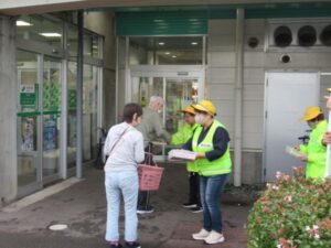10月がたっしゃけ 気つけられェ月間であることから、10月16日(木)10時から、朝日町ショッピングセンターアスカにおいて、黒東交通安全協会朝日町の支部長や女性部会・高齢者部会の会員約15名が、高齢者が多く買い物に訪れるシルバーデーに、反射材の活用・横断歩道の利用とハンドサインの励行、一般ドライバーへの思いやり運転等を呼びかけ高齢者の事故防止をはかる「たっしゃけ 気つけられェ」キャンペーンを実施しました。