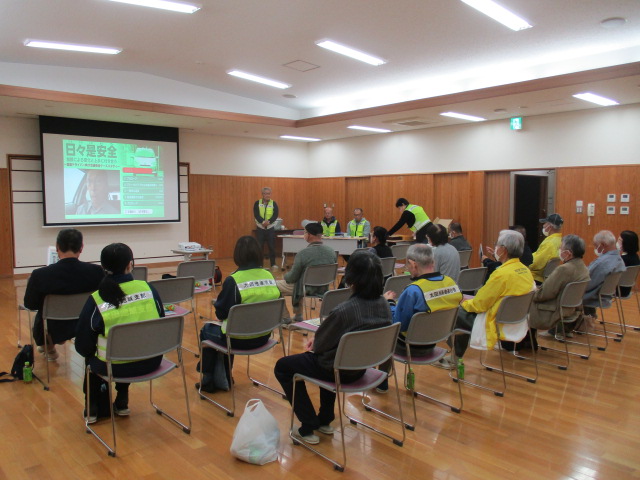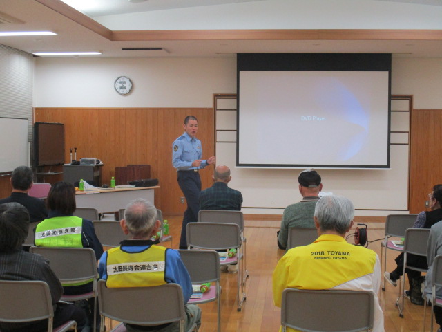10月24日(金)午後7時から、富山市太田地内の太田公民館において、富山南交通安全協会太田地域支部が企画した交通安全運転者講習会が行われました。同講習会には、太田地域支部管内に居住する運転免許保有者約20人のほか、富山南警察署員、太田地域支部役員が参加し、初めに交通安全DVDを視聴した後、富山南警察署交通課の松島係長さんから、夜間事故防止等についてお話を聞きました。最後にお楽しみ抽選会を行い、交通安全協会で用意した交通安全グッズを参加者にプレゼントして終了しました。夕暮れ時から夜間にかけての交通事故が多発する時期を迎えて、有意義な講習会となりました。