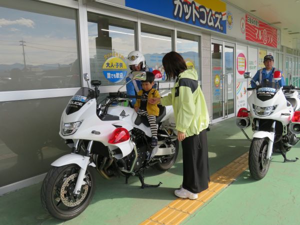 10月25日(土)、らくらグリーンモール福光店において、パトカー乗車体験、気いつけんまいけカー体験及び白バイ乗車体験を開催し、警察署と協力して反射材を買い物客に手渡し交通安全を呼びかけました。