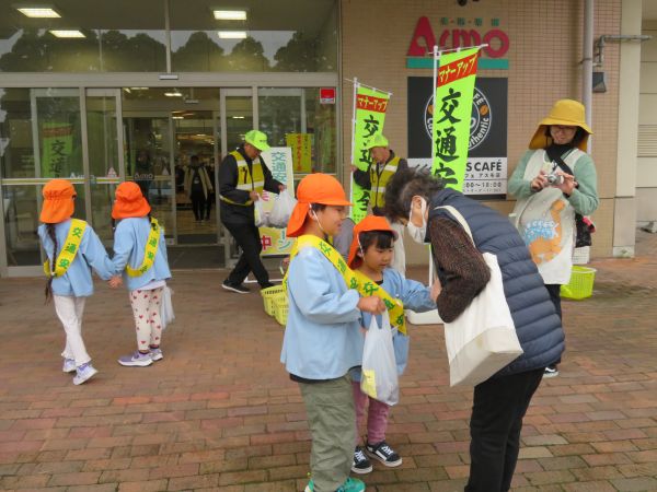 10月22日(水)、南砺市井波地内の「井波コミュニティプラザアスモ」で南砺市交通安全協会山野地区支部(高田実支部長)は、、山野保育園、山野地域づくり協議会役員、南砺警察署員ら20名と連携し、山野保育園園児8名は警察官に扮した「やまのキッズポリス」となり地元特産の里芋、手作りのキーホルダーマスコット等100個を買い物客に手渡し、交通安全を呼びかけました。