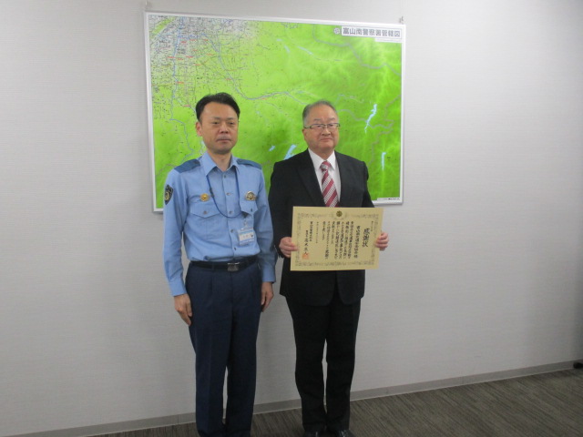 富山南警察署管内の交通死亡事故ゼロの日数が、10月25日(土)午前0時をもって350日を達成したことから、当協会に対し警察本部長感謝状が授与されました。感謝状伝達式は、10月29日(水)午前10時から富山南警察署署長室で行われ、平野富山南警察署長から当協会の稲田協会長に対し感謝状の伝達が行われました。感謝状の伝達を受け、稲田協会長から、「地域住民の皆さんが交通安全に努めて頂いた結果であり、住民の皆さん全員が頂いた感謝状です。これからも交通安全活動の推進に努めて参ります。」との言葉がありました。