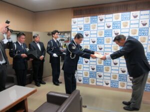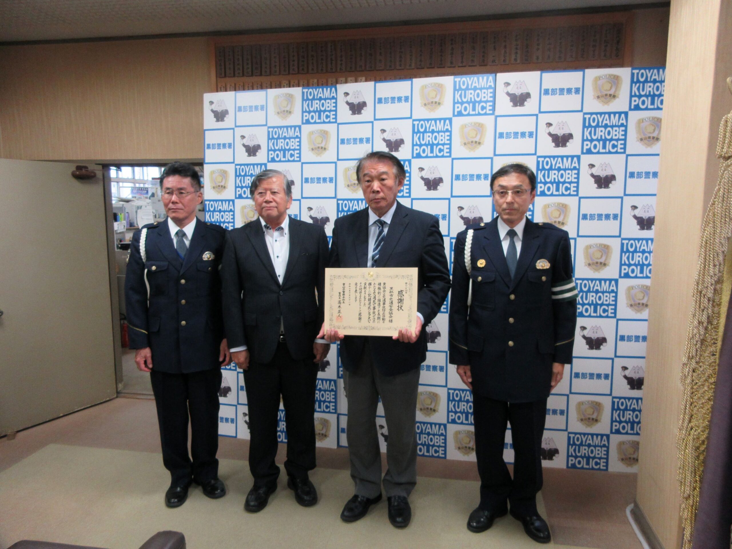 黒部警察署管内の死亡事故ゼロの記録が450日を達成したことから、11月6日(木)に黒部警察署の署長室において、寺島署長から当協会の川本協会長に対し、警察本部長感謝状が伝達されました。