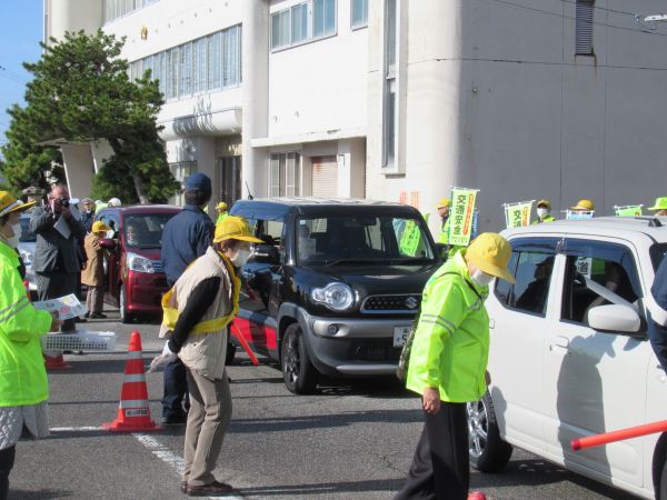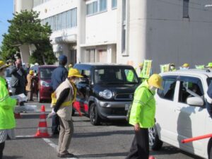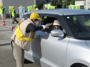 11月11日(火)午前10時から、入善警察署前において、黒東交通安全協会や交通安全関係団体の約40名が、これから見にくい夕暮れの時間帯が早くなりことから、交通事故の多発が懸念されることから、入善警察署前を通る通行車両の運転者等に、チューリップの球根と3UP運動のチラシを手渡し、ライトアップの励行とチューイアップ・チェックアップを呼びかける事故防止キャンペーンを実施しました。
