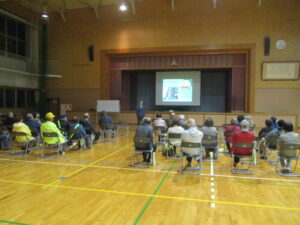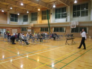 11月14日(金)午後7時から、富山市山室荒屋地内の富山市立山室中部小学校体育館において、富山南交通安全協会山室中部地域支部が企画した交通安全運転者講習会が行われました。同講習会には、山室中部小学校区の運転免許保有者約40人が参加し、初めに交通安全DVDを視聴した後、富山南警察署交通課の松島係長さんから夜間事故防止に関して前照灯のこまめな切り替えや反射材の活用についてのお話を聞きました。最後にお楽しみ抽選会を行い、交通安全協会で用意した交通安全グッズを参加者全員にプレゼントして講習会を終了しました。日暮れが早くなり夜間の交通事故が増加する時期を迎えて、交通安全意識の高揚を図る有意義な講習会となりました。