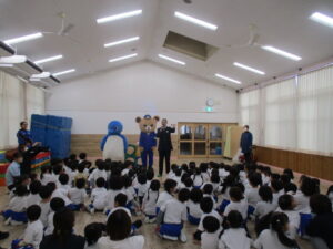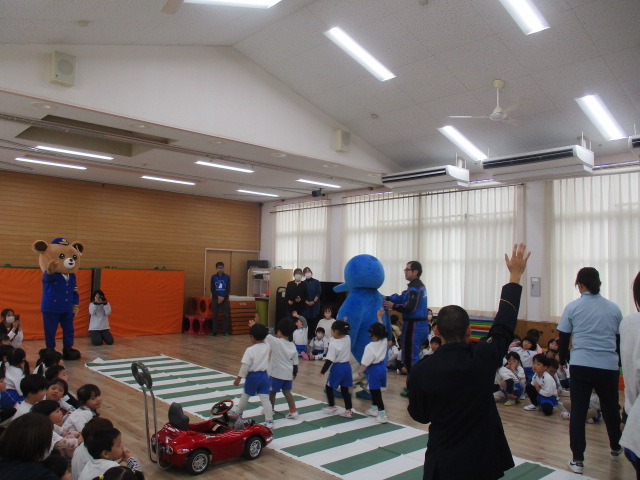 11月18日(火)午前10時から、富山市上大久保地内の社会福祉法人すこやかこども福祉会「大沢野こども園」において、交通安全教室が行われました。同交通安全教室には、年少、年中、年長組の園児約100人のほか、富山南警察署員、ネッツトヨタ富山㈱富山南店社員、富山南交通安全協会事務局員が参加し、初めに交通安全DVDを視聴した後、富山南警察署交通課の松島係長さんから横断歩道の安全な渡り方についてのお話を聞き、模擬横断歩道を使用して横断歩道の安全な渡り方を実習しました。最後に、園児達の交通安全を願って、ネッツトヨタ富山㈱富山南店と富山南交通安全協会から園児の代表に交通安全グッズのプレゼントがありました。同交通安全教室には、ネッツトヨタ富山㈱の交通安全キャラクター「ペンギンのアミー君」と富山南交通指導員連絡協議会のマスコット「くまちゃん」も参加し、園児達の人気を集めていました。