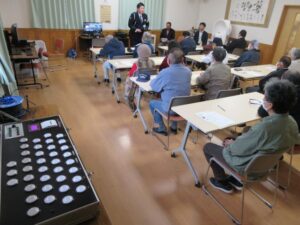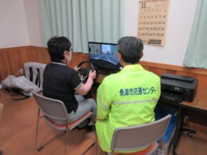 魚津警察署地域交通課長の講話の後、「視野診断計」「動体認知測定装置」「ドライブチェッカー」「点灯くん」の4機器を使用して体験学習を受講しました。