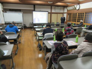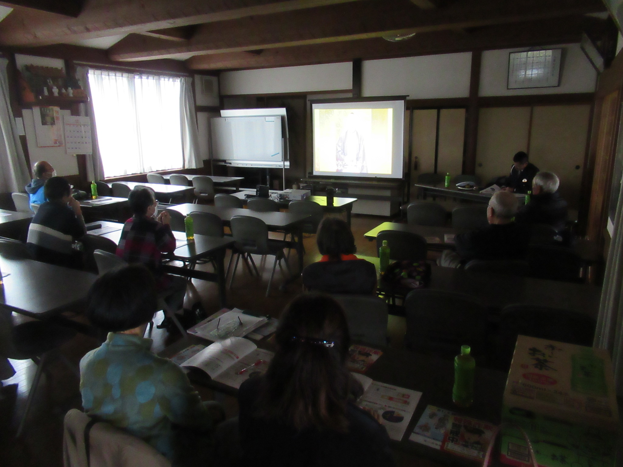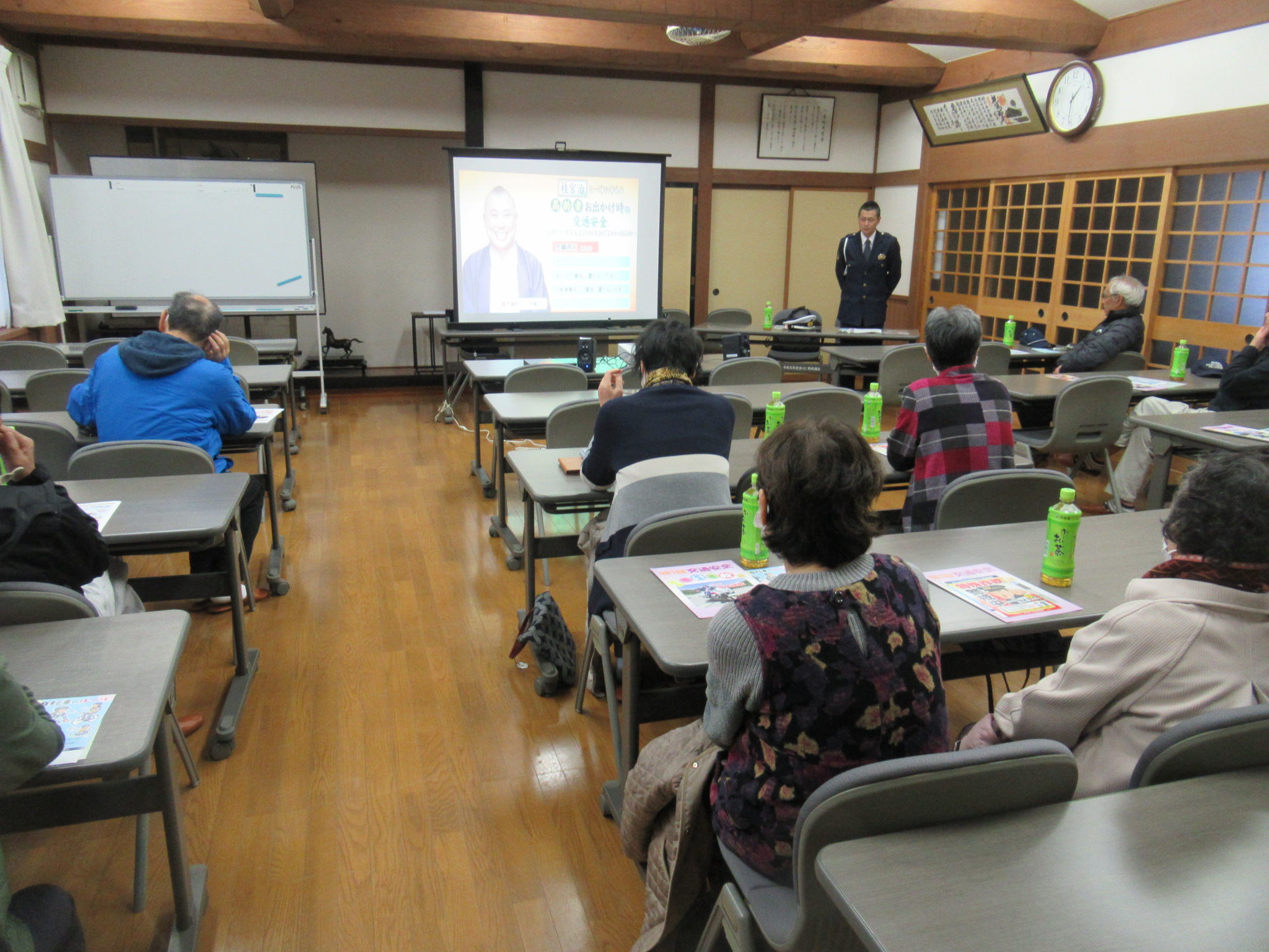 12月3日午後1時30分から、入善町荒又公民館において荒又地区福寿会の高齢者13名の交通安全教室を開催しました。入善警察署交通係長が講師となり、いきいき教室のテキストを使用して交通安全教室を行ったほか、自転車の違反についての青切符処理となることの周知を行いました。また教室では交通安全協会のDVD「高齢者お出かけ時の交通安全」を視聴してもらいとともに、参加者の靴の踵部に反射材を貼付し、反射材の活用を呼びかけました。