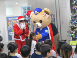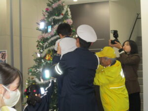 12月8日(月)午前10時から、富山南警察署一階ロビーにおいて富山南交通安全協会蜷川、堀川、堀川南地域支部(通称三本川)が合同で企画した交通安全クリスマスツリー点灯式が行われました。同点灯式には、富山南警察署員、蜷川、堀川、堀川南地域支部役員のほか、社会福祉法人「いちい保育園」の年長組園児26名が参加し、初めに富山南警察署交通課の松島係長さんから、横断歩道の安全な渡り方についてお話を聞いた後、参加者全員でクリスマスツリーに飾り付けを行いツリーを完成させました。最後に園児代表が、カウントダウンの後クリスマスツリーを点灯させ光り輝くツリーのもと、交通事故防止を願いました。式終了後、警察官が扮したサンタクロースと富山南交通指導員連絡協議会のマスコット「くまちゃん」が登場し、園児全員に一人一人クリスマスプレゼント手渡しました。